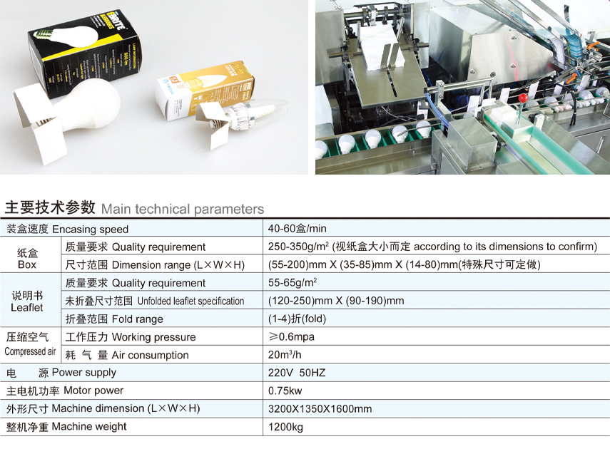 本產(chǎn)品是我公司結(jié)合國外包裝機的先進技術(shù)及根據(jù)目前照明、電子等行業(yè)的實際情況而研發(fā)的具有新型、先進的包裝機械設(shè)備,是機、電、氣、光一體化的高科技產(chǎn)品。本產(chǎn)品適用于照明、電子等行業(yè)各類球泡燈、蠟燭(尾)燈、筒燈、射燈、單端熒光燈、節(jié)能燈、鎮(zhèn)流器等等以及相類似物品的裝盒包裝。該機還具有自動完成使用說明書的折疊、紙盒自動打開、單邊內(nèi)村自動上料、物品帶內(nèi)襯和說明書-起自動裝盒、封盒等功能。同時也是解決目前招工難、管理難而代替勞動力的先進自動包裝設(shè)備。該機可以單獨使用亦可以與其他設(shè)備聯(lián)動使用,形成成套生產(chǎn)聯(lián)動線。