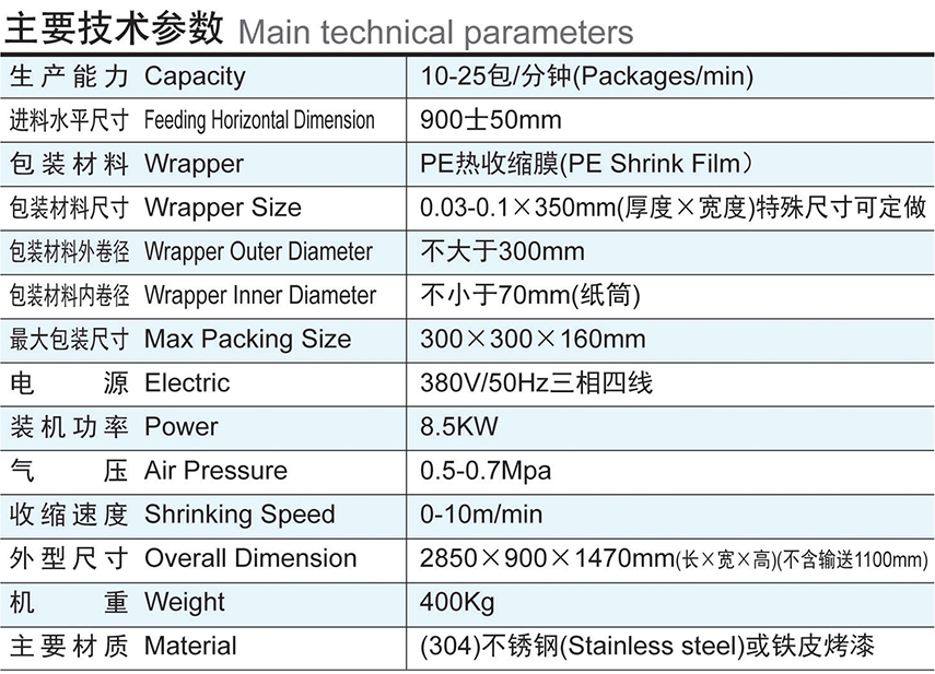 本產(chǎn)品適用于裝盒機紙盒出來后集盒包裝,是用PE膜進行袖口式熱收縮包裝。包裝方式有:單排包裝、前后排包裝、上下排包裝。進料包裝時可自動完成物品堆疊方式、輸送到位、自動將包裝膜輸送、進行自動切封膜、然后收縮等功能;本設(shè)備是人機界面PLC控制,光電跟蹤、變頻調(diào)速;運行中出現(xiàn)異常能自動顯示故障原因,及時排除故障。該機可單獨使用,亦可與裝盒機連接成自動生產(chǎn)聯(lián)動線。