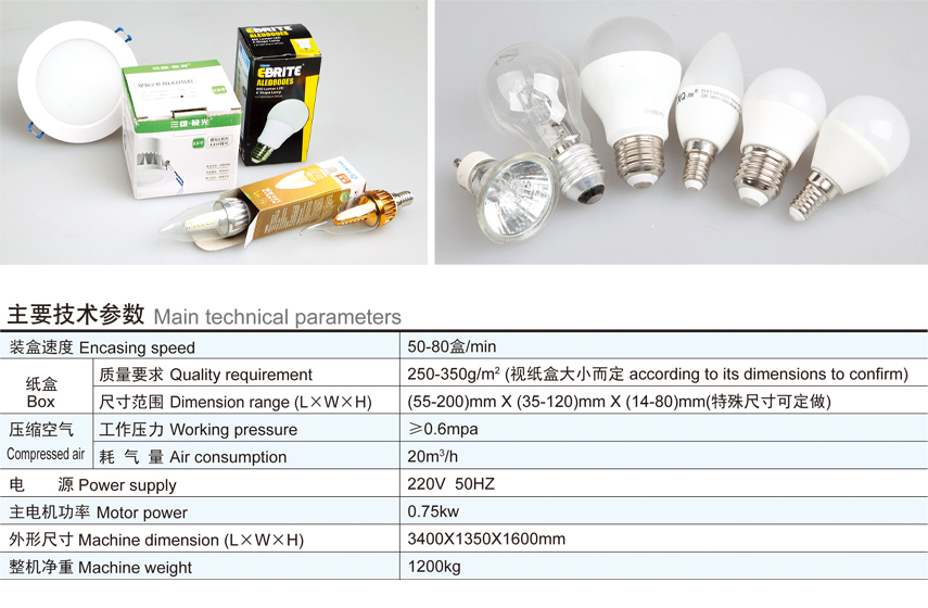 This product is a new type of advanced packaging machinery and equipment that combines the advanced technology of foreign packaging machines with the actual conditions of the current lighting, electronics and other industries. It is a high-tech product integrating machine, electricity, gas and light. This product is suitable for all kinds of bulbs, candles (tail) lamps, downlights, spotlights, single-ended fluorescent lamps, energy-saving lamps, ballasts, etc. in the lighting, electronics and other industries, as well as the packaging of similar items. It has the functions of automatically opening the carton, cartoning the goods, sealing the box, etc. At the same time, it is also an advanced automatic packaging device that solves the current difficult recruitment and difficult management and replaces the labor force. The machine can be used alone or in conjunction with other equipment to form a complete production linkage line.