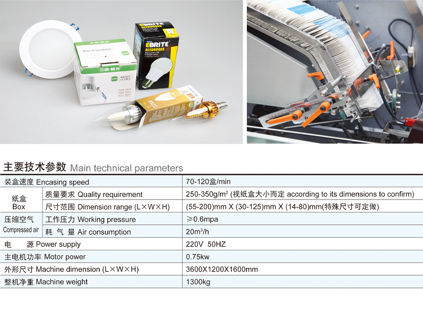This product is a new type of advanced medium-speed packaging machinery and equipment developed by our company in combination with the advanced technology of foreign packaging machines and the actual situation of the current lighting, electronics and other industries. It is a high-tech integrated machine, electricity, gas and light. product. This product is suitable for all kinds of bulbs, candles (tail) lamps, downlights, spotlights, single-ended fluorescent lamps, energy-saving lamps, ballasts, etc. in the lighting, electronics and other industries, as well as the packaging of similar items. It has the functions of automatically opening the carton, cartoning the goods, sealing the box, etc. At the same time, it is also an advanced automatic packaging device that solves the current difficult recruitment and difficult management and replaces the labor force. The machine can be used alone or in conjunction with other equipment to form a complete production linkage line.